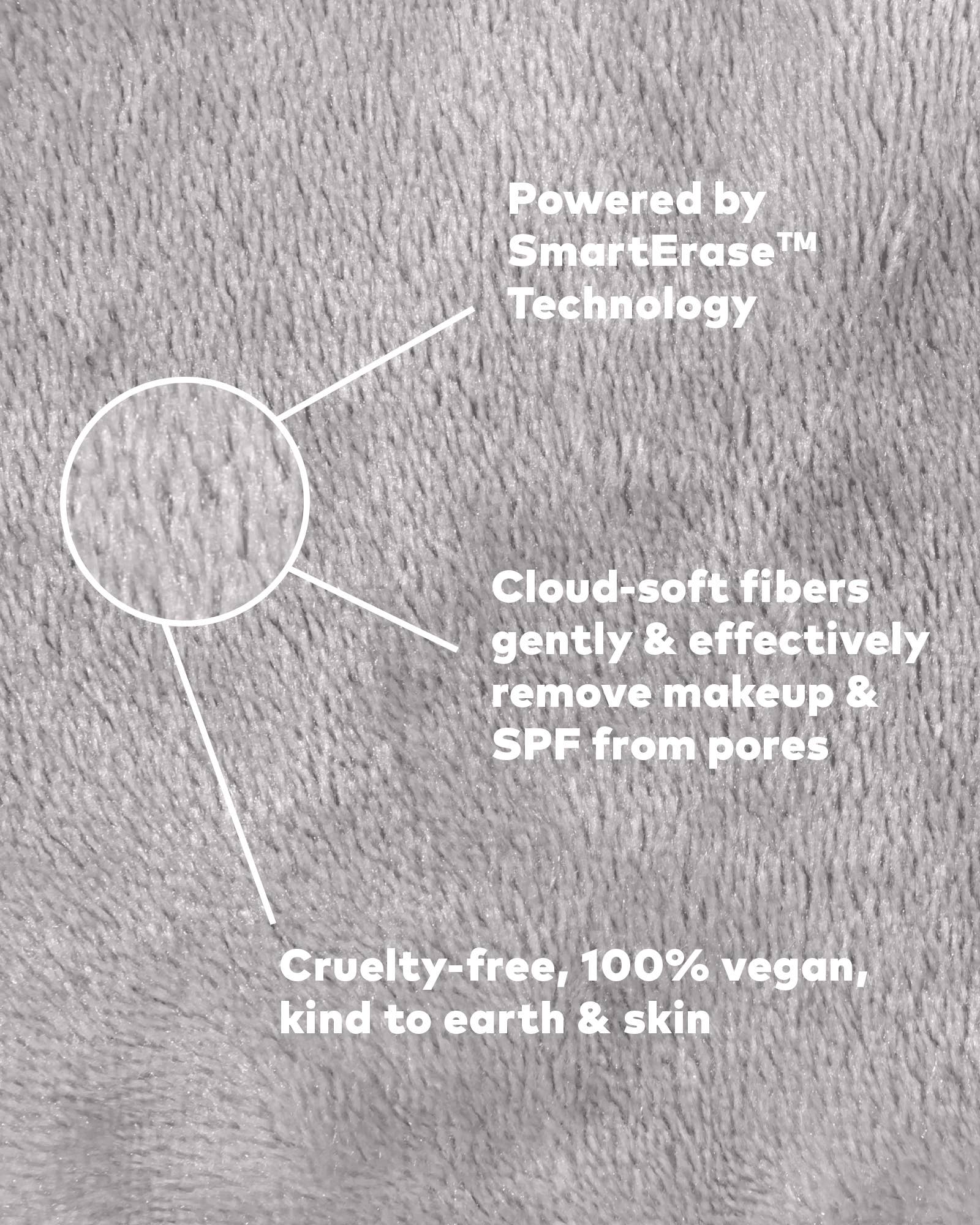 Erase all makeup with JUST WATER™ including waterproof. Our patented, water-activated makeup remover uses cloud-soft fibers to gently & easily remove all cosmetics & sunscreen from pores. 2 in 1 benefit: one side removes makeup & one side exfoliates.